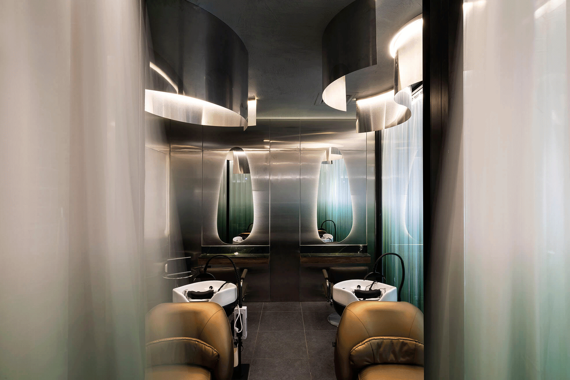 The haircutting station features a mixture of free-standing and wall-mounted mirrors, whilst the hair washing area is screened off with full height translucent curtains that add an otherworldly feel and tranquillity to the space.