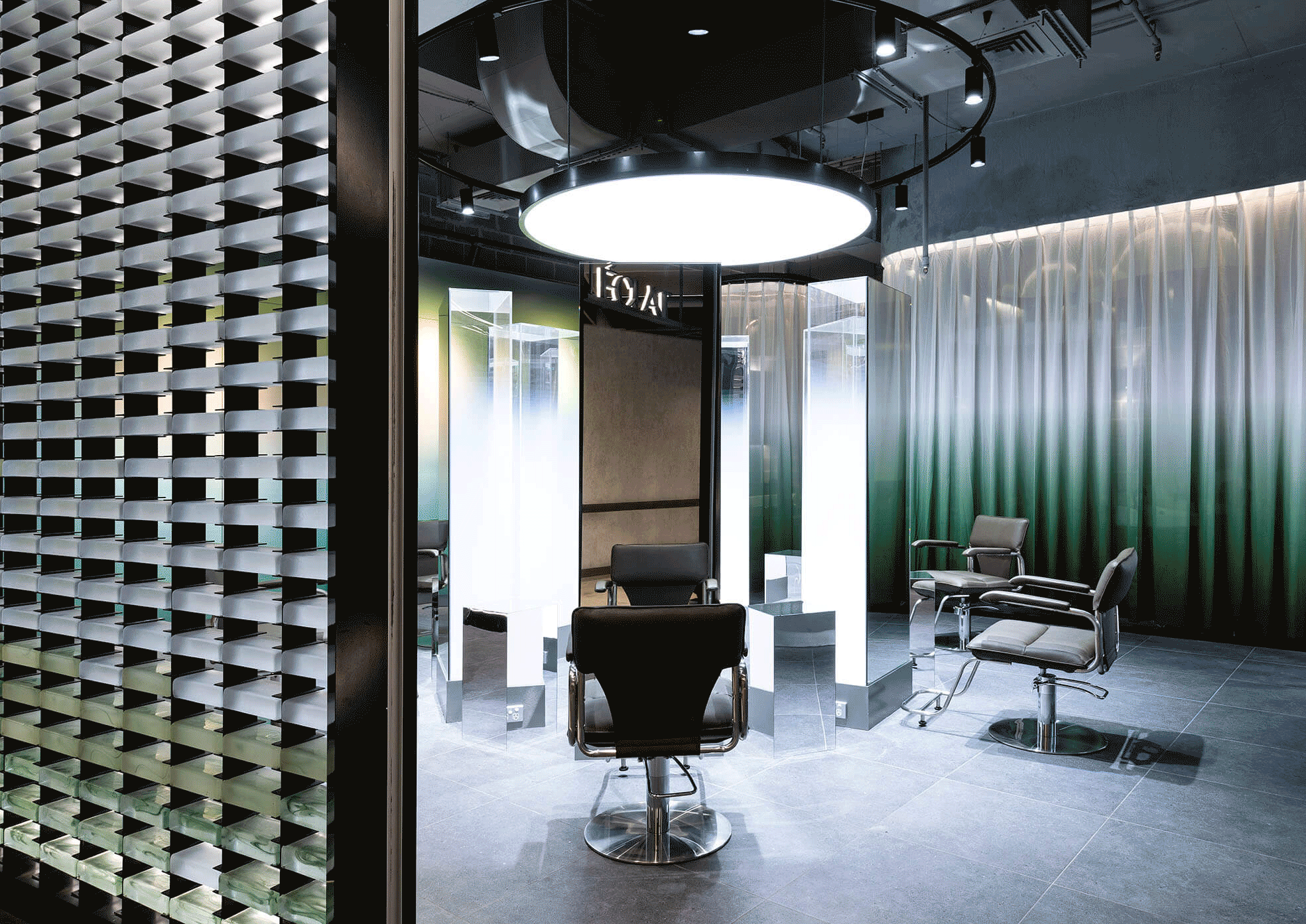 Éclat Atelier’s primary colour and material palettes are monochromatic, a harmony of various shades of silver and grey. Despite being monotone, a myriad of textures and reflective intensities make this hair studio an enchanting place that triggers curiosity.