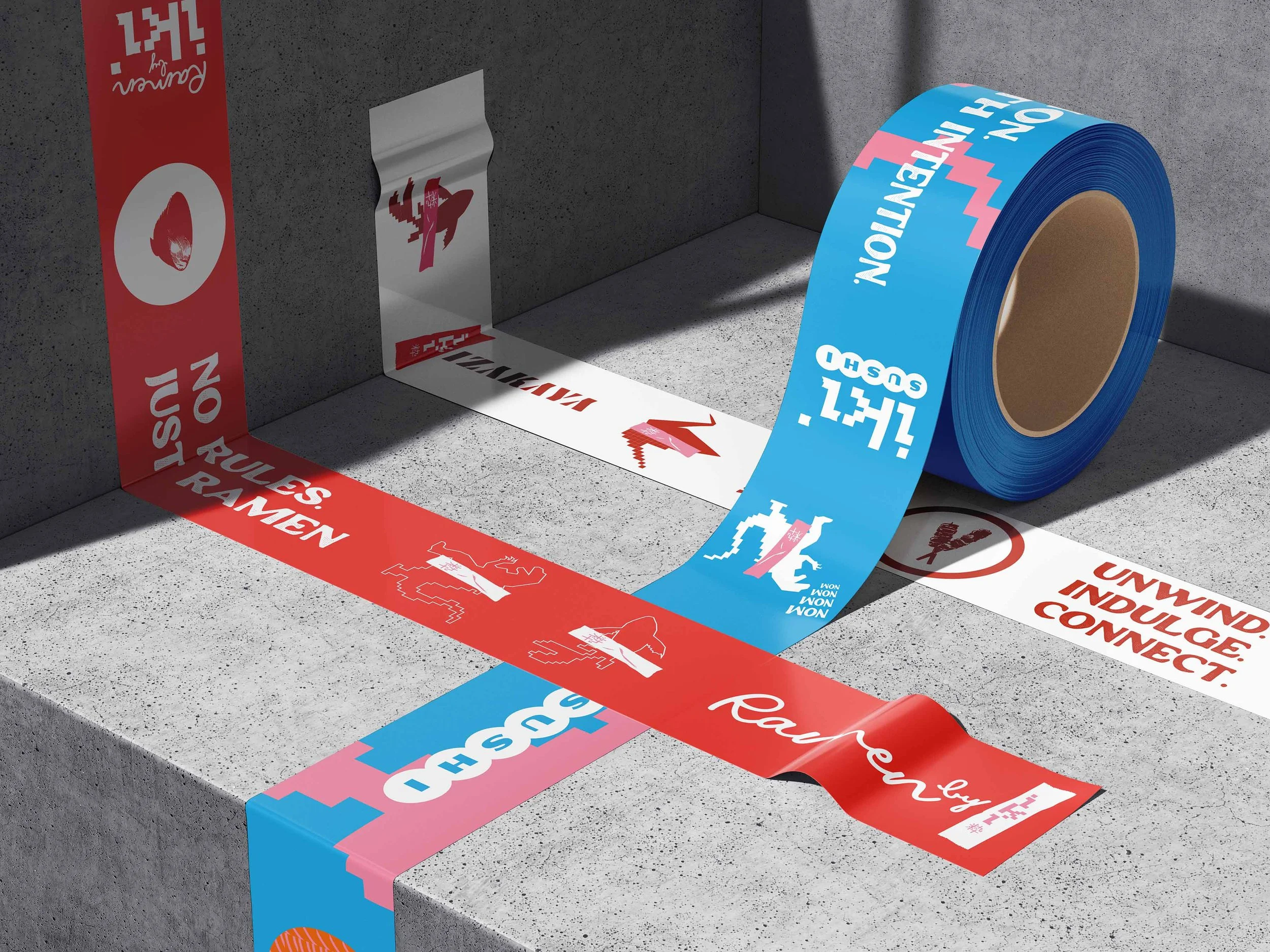 The design approach centred on creating a visual language that could move seamlessly between brand and space. Graphic motifs inspired by motion, rhythm, and play were developed to support the energetic character of the brand, appearing across packaging, signage, and environmental graphics. The identity system allows each dining concept to express its own personality through colour, typography, and graphic variation while remaining recognisably part of the Iki family.