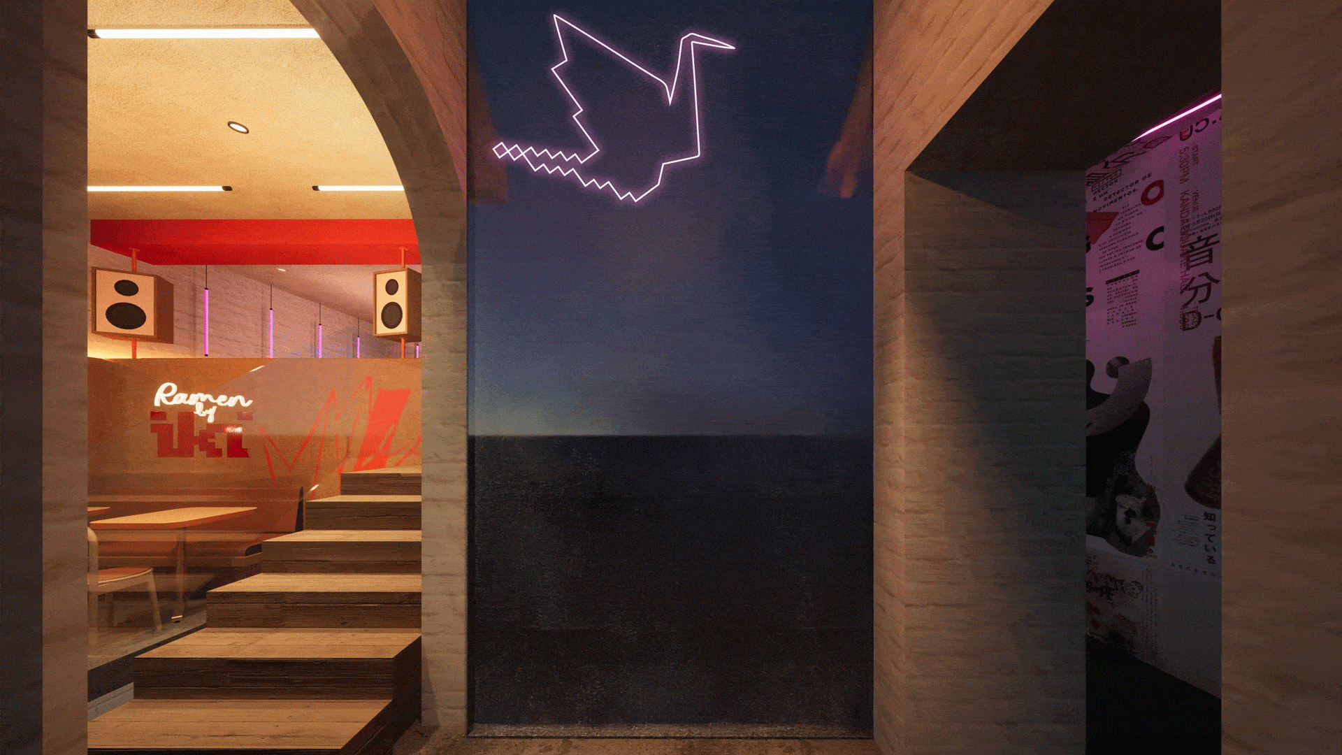 Ramen by Iki captures the bold and energetic spirit of Japanese ramen culture through a vibrant restaurant branding and interior design approach. The design embraces expressive graphics, bold colour contrasts, and illuminated signage to create a lively atmosphere inspired by urban ramen bars in Japan.