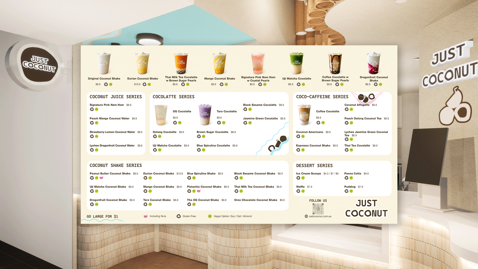 The innovation of Just Coconut lies in translating a single ingredient into a complete café design and brand identity. Coconut becomes both product and motif, expressed through simple iconography, modular joinery, and a light, tropical-inspired palette that works across interiors, signage, and packaging.