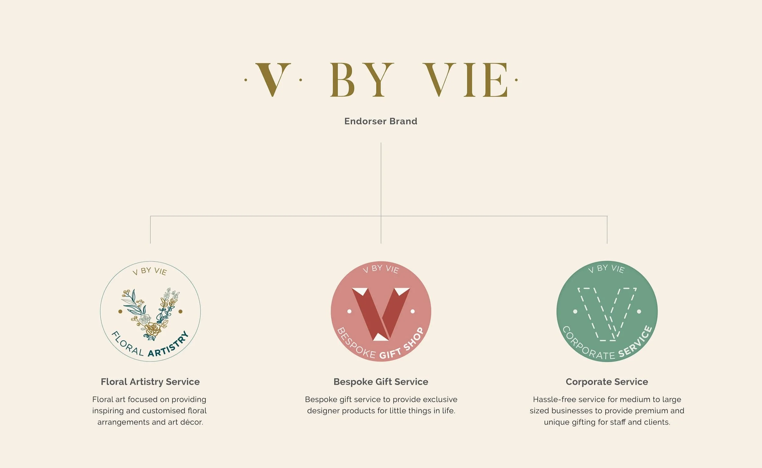 As with many businesses, the retail offerings of V by Vie underwent developments and change within their first few years of operation. Our brief was to expand their branding system to highlight the different services that they offer; their floral artistry collection, bespoke gifting range and their corporate packages. Each required a distinctive look and character, while still aligning with the overall V by Vie brand. Within the existing brand, the core aspects included the creative and artistic nature of the creators, and the welcoming personality that they had cultivated.